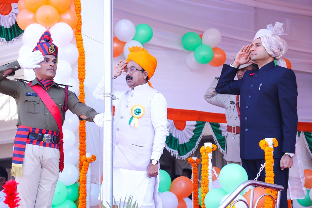 रायगढ़, 26 जनवरी 2025/ रायगढ़ में 76 वां गणतंत्र दिवस हर्ष एवं उल्लास के साथ मनाया गया। शहीद कर्नल विप्लव त्रिपाठी स्टेडियम में आयोजित मुख्य समारोह में उप मुख्यमंत्री श्री अरूण साव ने झंडा फहराया। इसके पश्चात राष्ट्रगान का गायन किया गया व पुलिस बल, होम गार्ड्स, एनसीसी कैडेट्स व स्काउट गाईड्स की टुकडिय़ों द्वारा सलामी दी गई। उप मुख्यमंत्री श्री साव ने शांति के प्रतीक श्वेत कपोत तथा तिरंगे गुब्बारे आकाश में उड़ाये। इस मौके पर उप मुख्यमंत्री श्री साव ने मुख्यमंत्री के जनता के नाम संदेश का वाचन किया।