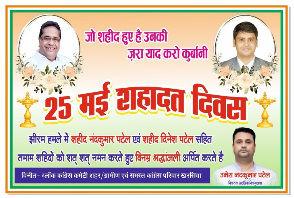 छत्तीसगढ़/खरसिया, 24 मई 2025 – खरसिया विधानसभा क्षेत्र के इतिहास पुरुष और देशभक्त शहीद नंदकुमार पटेल एवं शहीद दिनेश पटेल की पुण्यतिथि (शहादत दिवस) पर 25 मई, रविवार को खरसिया में विशेष श्रद्धांजलि एवं सेवा कार्यक्रम आयोजित किए जाएंगे। यह अवसर शहीदों को सम्मानित करने के साथ-साथ समाज सेवा की भावना को भी जागृत करने का एक महत्वपूर्ण दिन होगा।