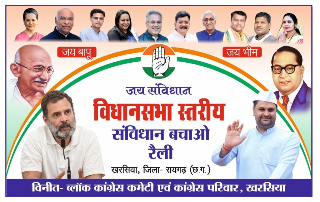 खरसिया। छत्तीसगढ़ प्रदेश कांग्रेस कमेटी के निर्देशानुसार, जिला कांग्रेस कमेटी रायगढ़ के मार्गदर्शन में ब्लॉक कांग्रेस कमेटी शहर/ग्रामीण एवं कांग्रेस परिवार खरसिया द्वारा विधानसभा स्तरीय संविधान बचाओ रैली का आयोजन किया जा रहा है। यह रैली 14 जून 2025, शनिवार को शहीद नंदकुमार पटेल स्मारक स्थल, रेस्ट हाउस के सामने शाम 4:30 बजे आयोजित होगी। इस कार्यक्रम का मुख्य उद्देश्य संविधान के मूल्यों की रक्षा और जन जागरूकता को बढ़ावा देना है।