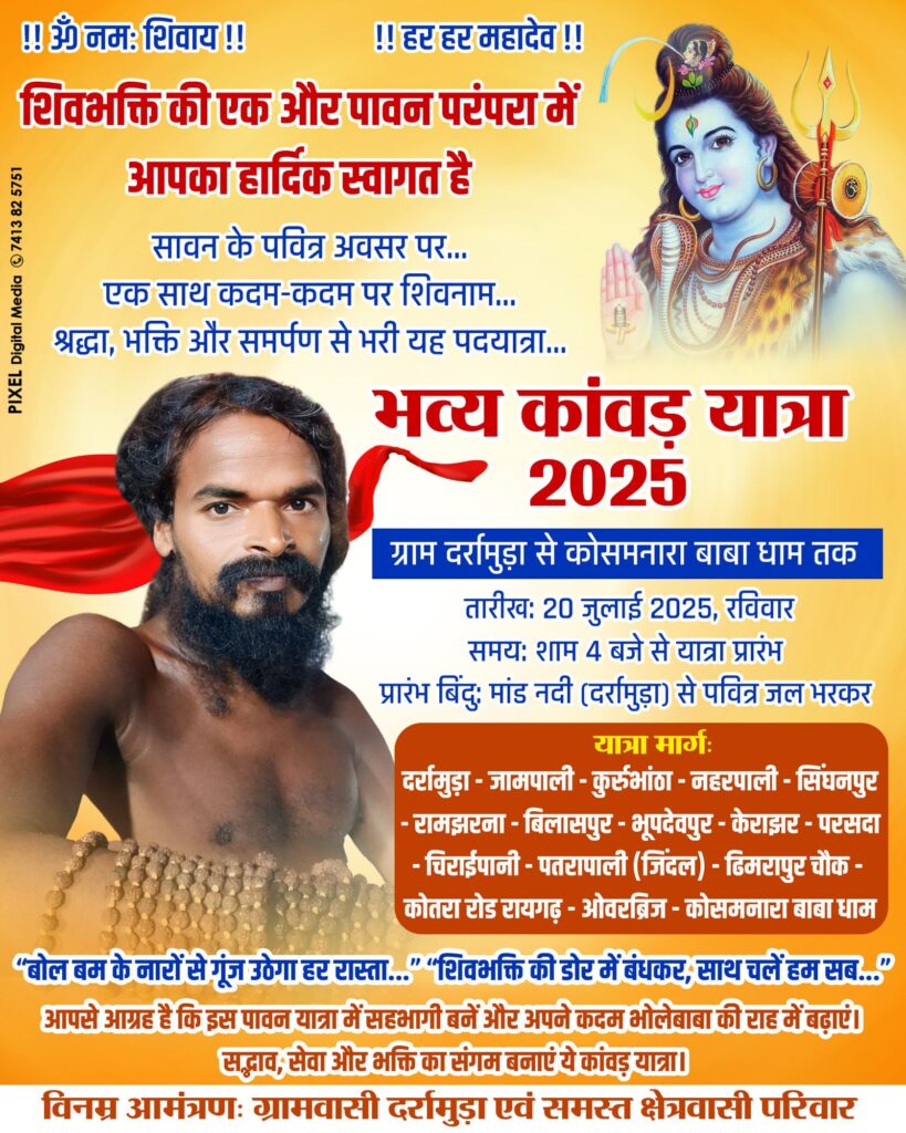 रायगढ़-खरसिया। सावन का पवित्र महीना आते ही भगवान भोलेनाथ के भक्तों में उत्साह का माहौल छा जाता है। इस बार भी खरसिया के ग्राम दर्रामुड़ा से रायगढ़ जिला मुख्यालय से करीब 7 किलोमीटर दूर ग्राम कोसमनारा में स्थित श्री श्री 108 सत्यनारायण बाबा धाम तक भव्य कांवड़ यात्रा का आयोजन किया जा रहा है। यह यात्रा 20 जुलाई, रविवार को शाम 4 बजे से शुरू होगी, जिसमें भारी संख्या में भक्त शामिल होकर भगवान शिव की भक्ति में लीन होंगे।