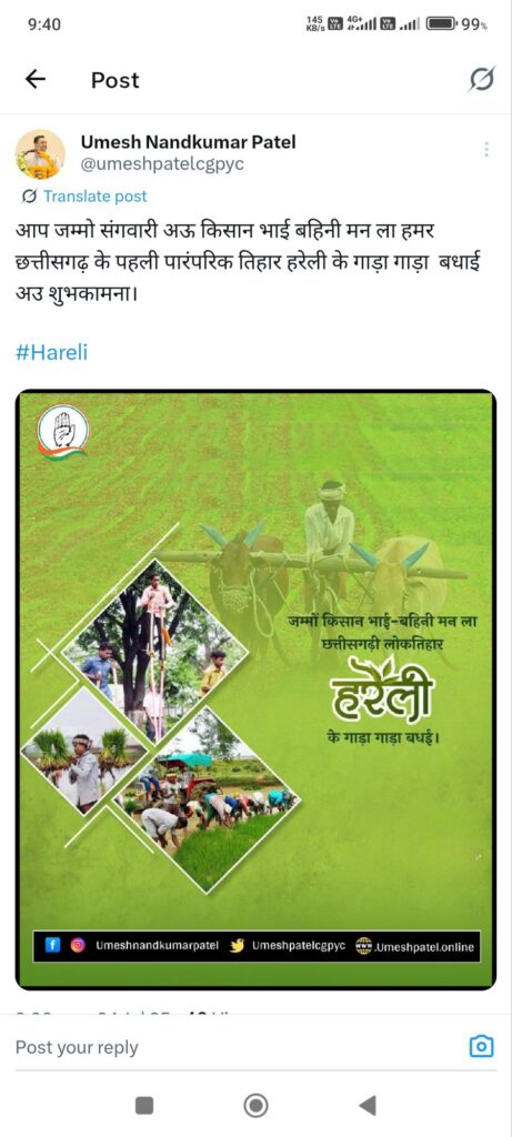 उमेश पटेल ने छत्तीसगढ़ी में लिखा – “आप जम्मो संगवारी अऊ किसान भाई बहिनी मन ला हमर छत्तीसगढ़ के पहली पारंपरिक तिहार हरेली के गाड़ा गाड़ा बधाई अउ शुभकामना।” यह संदेश न सिर्फ एक औपचारिक शुभकामना है, बल्कि किसानों के प्रति उनके आत्मीय लगाव और आदर का भी प्रतीक है। हरेली पर्व विशेष रूप से ग्रामीण अंचलों में खेती-बारी से जुड़े उपकरणों की पूजा, बैल-गायों की सजावट और पारंपरिक खेलों के आयोजन के लिए जाना जाता है।