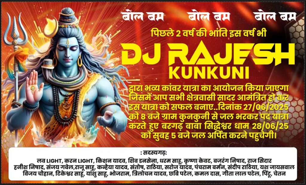 खरसिया-रायगढ़। रायगढ़ जिले का सबसे फेमस और नंबर वन डीजे राजेश कुनकुनी, पिछले दो वर्षों की भांति इस वर्ष भी भव्य कांवड़ यात्रा का आयोजन करने जा रहे हैं। यह पावन यात्रा 27 जुलाई 2025 की रात 8 बजे ग्राम कुनकुनी से जल भरकर प्रारंभ होगी, जो पदयात्रा के रूप में जयघोष करते हुए बरगढ़ स्थित श्री सिद्धेश्वर नाथ मंदिर पहुंचेगी। वहाँ शिवभक्त 28 जुलाई की सुबह 5 बजे भगवान शिव को पवित्र जल अर्पित करेंगे। पिछले दो वर्षों की तरह इस वर्ष भी यात्रा को और अधिक भव्य व ऐतिहासिक बनाने की तैयारी जोरों पर है। आयोजन समिति ने समस्त श्रद्धालुओं और क्षेत्रवासियों से इस धार्मिक आयोजन में सपरिवार शामिल होने की अपील की है।
