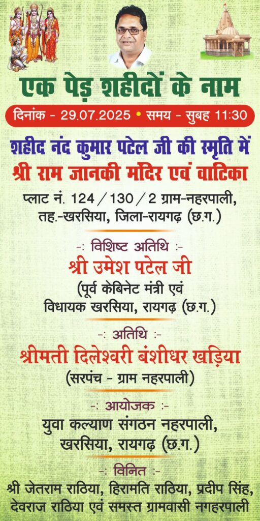 रायगढ़। खरसिया के ग्राम नहरपाली में 29 जुलाई 2025 को “एक पेड़ शहीदों के नाम” विशेष कार्यक्रम का आयोजन किया जा रहा है। यह आयोजन शहीद नंदकुमार पटेल जी की पुण्य स्मृति में किया जा रहा है, जिसकी जानकारी आयोजन समिति के सक्रिय सदस्य प्रदीप सिंह ने दी।