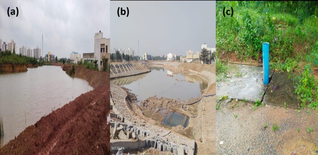 चित्र 1. (a) नवीनीकरण से पहले जल निकाय (b) नवीनीकरण के बाद जल निकाय और (c) वर्षा जल संचयन गड्ढे की स्थापना