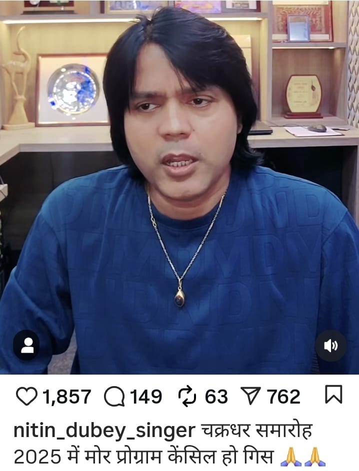 रायगढ़। छत्तीसगढ़ की भूमि पर जन्मे छत्तीसगढ़ के लोकप्रिय कलाकारों में से एक गायक, संगीतकार एवं अभिनेता नितिन दुबे का कार्यक्रम रायगढ़ में होने वाले ऐतिहासिक चक्रधर समारोह 2025 में 1 सितम्बर 2025 को तय था। पूरी मीडिया में उनका नाम था और जगह-जगह बैनर-पोस्टर में उनके बड़े-बड़े फोटो हुए लगे थे। लेकिन अचानक बजट की कमी का हवाला देकर आयोजन समिति ने उनका प्रोग्राम कैंसल कर दिया। इस पूरे मामले की जानकारी नितिन दुबे ने अपने इंस्टाग्राम और फेसबुक ऑफिशियल हैंडल पर वीडियो जारी कर दी।