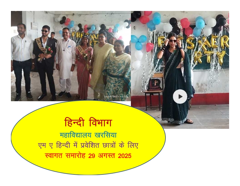उच्च शिक्षा विभाग के निर्देश पर हिंदी विभागाध्यक्ष डॉ रमेश टंडन शासकीय महात्मा गाँधी स्नातकोत्तर महाविद्यालय खरसिया ने जुलाई में हिंदी विभाग के लिए प्राचार्य और आई क्यू ए सी समन्वयक की सहमति से पूरे सत्र 2025 – 26 का विभागीय कैलेन्डर तैयार किया है, जिसके अनुसार दिनांक 29 अगस्त 2025 को तृतीय सेमेस्टर के छात्रों के द्वारा प्रथम सेमेस्टर के नव प्रवेशित छात्रो का आत्मीय स्वागत किया गया. प्रवेश द्वार पर ही सभी नव प्रवेशित छात्रों का शानदार स्वागत किया गया. तदुपरान्त विभागीय चतुष्टय शिक्षकों के द्वारा माँ शारदे की पूजा की गयी. अपने उद्बोधन में डॉ आर के टंडन ने छात्रों को एम ए हिंदी के साथ-साथ नेट और सेट की तैयारी के लिए भी प्रेरित किया. साथ ही एम ए के प्रत्येक सेमेस्टर में दो आंतरिक परीक्षा में सम्मिलित होने और एक सेमिनार प्रस्तुतीकरण की अनिवार्यता का स्मरण कराया. डॉ डायमण्ड साहू, सुश्री अंजना शास्त्री और कुसुम चौहान ने भी छात्रों को हिंदी विषय चुनने पर बधाई दी. प्रथम सेमेस्टर के कुछ छात्रों ने बी एस सी उपरांत कुछ अच्छा सीखने के लिए हिंदी में प्रवेश लेने की बात कही.