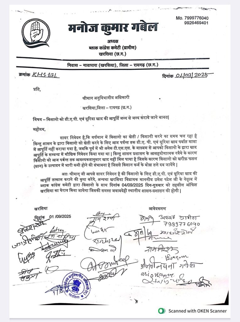 खरसिया। खरीफ सीजन के बीच क्षेत्र के किसानों को डीएपी और यूरिया खाद की पर्याप्त आपूर्ति न होने से आक्रोश बढ़ता जा रहा है। इसी मुद्दे को लेकर खरसिया विधायक उमेश पटेल के मार्गदर्शन में खरसिया ब्लॉक कांग्रेस कमेटी (शहर एवं ग्रामीण) ने सोमवार को अनुविभागीय अधिकारी को ज्ञापन सौंपा। कांग्रेस नेताओं ने चेतावनी दी है कि यदि तुरंत खाद की आपूर्ति सुनिश्चित नहीं की गई तो 4 सितंबर को तहसील कार्यालय का घेराव कर उग्र आंदोलन किया जाएगा।