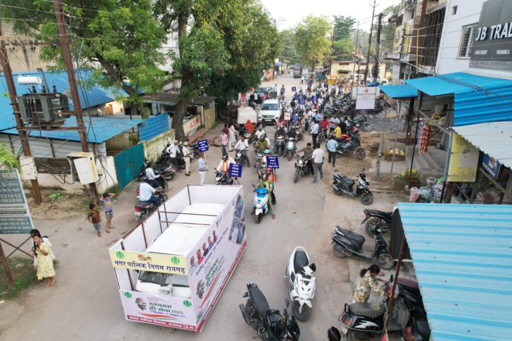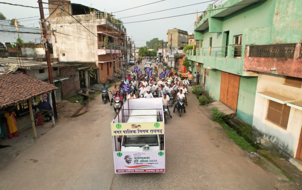 रायगढ़। स्वच्छता ही सेवा पखवाड़ा अंतर्गत निगम प्रशासन द्वारा बुधवार को बाइक रैली निकाली गई। इस दौरान महापौर श्री जीवर्धन चौहान, सभापति श्री डिग्री लाल साहू, आयुक्त श्री बृजेश सिंह क्षत्रिय सहित, एमआईसी सदस्यगण, पार्षद एवं निगम के अधिकारी कर्मचारियों ने शहरवासियों को शहर को स्वच्छ रखने संदेश देते हुए लोगों को स्वच्छता अपनाने के लिए प्रेरित किया। स्वच्छता ही सेवा पखवाड़ा अंतर्गत शहर को स्वच्छ रखने और निगम क्षेत्र के निवासियों में स्वच्छता के प्रति जागरूकता लाने विभिन्न कार्यक्रम आयोजित किए जा रहे हैं। 17 सितंबर से स्वच्छता पखवाड़ा का शुभारंभ कचरा संग्रहण करने वाले वाहनों की रैली निकाल कर किया गया।