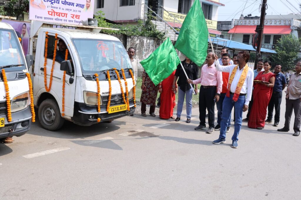 रायगढ़, 14 अक्टूबर 2025/ शासन के निर्देशानुसार एवं कलेक्टर श्री मयंक चतुर्वेदी के मार्गदर्शन में जिले में राष्ट्रीय पोषण माह का आयोजन 16 अक्टूबर तक किया जा रहा है। इसी क्रम में आज नगर निगम रायगढ़ के महापौर श्री जीवर्धन चौहान द्वारा पोषण रथ को हरी झंडी दिखाकर रवाना किया गया। इस अवसर पर उन्होंने कहा कि पोषण रथ आमजन को संतुलित आहार, स्वच्छता और स्वस्थ जीवनशैली के प्रति जागरूक करेगा। स्वस्थ समाज का निर्माण तभी संभव है जब हर नागरिक पोषण के महत्व को समझे।