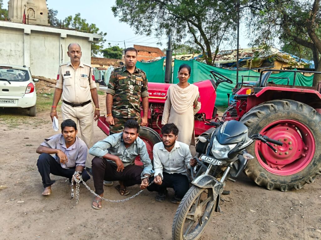 रायगढ़, 2 नवंबर। पुलिस अधीक्षक रायगढ़ श्री दिव्यांग कुमार पटेल के दिशा-निर्देशन एवं पुलिस अनुविभागीय अधिकारी खरसिया श्री प्रभात पटेल के मार्गदर्शन में चौकी खरसिया प्रभारी निरीक्षक अमित तिवारी के नेतृत्व में खरसिया पुलिस ने त्वरित कार्रवाई करते हुए हमालपारा से चोरी हुए ट्रैक्टर की बरामदगी कर तीन आरोपियों को गिरफ्तार किया है। पुलिस ने चोरी में प्रयुक्त मोटरसाइकिल सहित आरोपियों को न्यायिक रिमांड पर भेजा है।