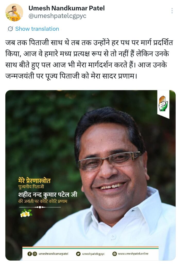 उमेश नंदकुमार पटेल ने अपने पिता शहीद नंदकुमार पटेल को उनकी जयंती पर श्रद्धांजलि दी। उन्होंने कहा कि उनके पिता आज भी उन्हें अपने बीते पलों के माध्यम से मार्गदर्शन देते हैं। शहीद नंदकुमार पटेल छत्तीसगढ़ के एक बड़े जननेता थे, जो 2013 में हुए झीरम घाटी नक्सली हमले में शहीद हो गए थे। उनके पुत्र उमेश पटेल वर्तमान में छत्तीसगढ़ की राजनीति में सक्रिय हैं और खरसिया विधानसभा क्षेत्र का प्रतिनिधित्व करते हैं। शहीद नंदकुमार पटेल की जयंती हर साल 8 नवंबर को छत्तीसगढ़ में कांग्रेस पार्टी और उनके समर्थकों द्वारा बड़े पैमाने पर मनाई जाती है, जिसमें विभिन्न श्रद्धांजलि कार्यक्रम आयोजित किए जाते हैं।