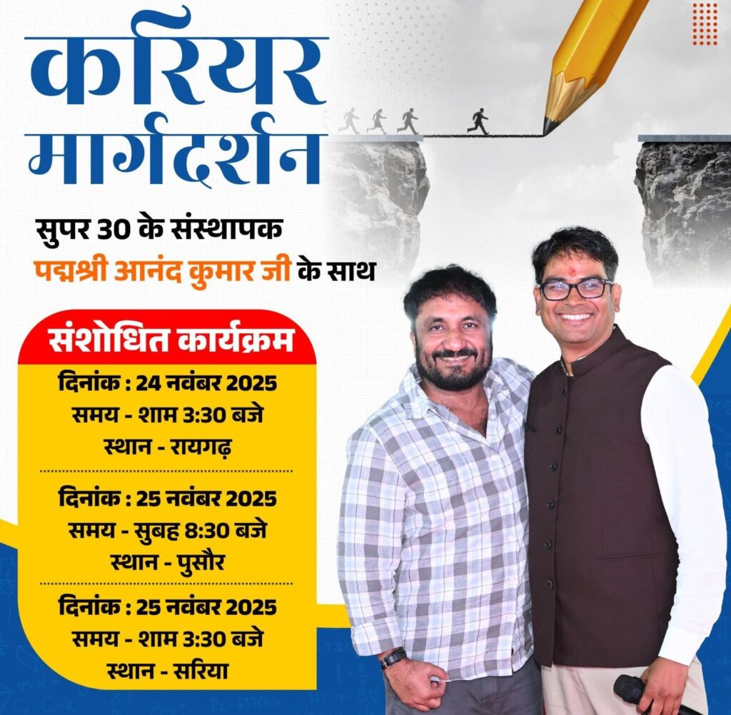 इस ऐतिहासिक आयोजन में देशभर के लाखों छात्रों के प्रेरणास्रोत, सुपर 30 के संस्थापक और पद्मश्री से सम्मानित श्री आनंद कुमार युवाओं से प्रत्यक्ष संवाद करेंगे और सफलता का मंत्र देंगे। यह आयोजन राज्य शासन की युवा-केंद्रित नीतियों तथा प्रदेश के वित्त मंत्री एवं रायगढ़ विधायक श्री ओ.पी. चौधरी की दूरदर्शी पहल का परिणाम है, जिसके माध्यम से जिले के हजारों छात्रों को उत्कृष्ट कैरियर मार्गदर्शन प्राप्त होने जा रहा है। कलेक्टर श्री मयंक चतुर्वेदी के निर्देशन में समूचा प्रशासनिक अमला इन आयोजनों को सफल और भव्य बनाने में जुट गए है।