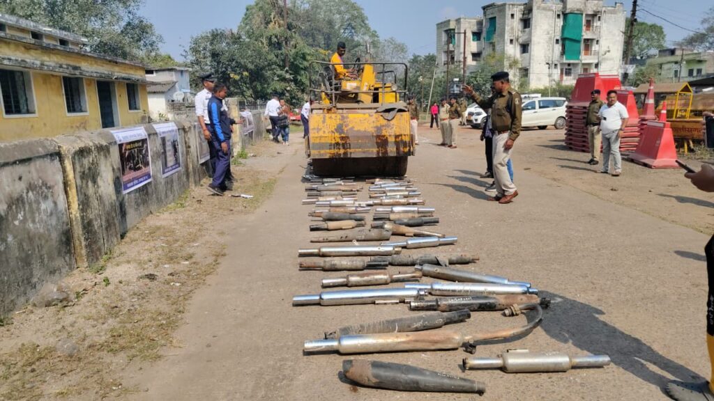 रायगढ़, 21 नवंबर । रायगढ़ पुलिस अधीक्षक श्री दिव्यांग पटेल के दिशा-निर्देशन पर शहर में यातायात नियमों के अनुपालन को लेकर चल रही सख्त मुहिम के बीच शुक्रवार को यातायात पुलिस ने मॉडिफाई साइलेंसरों पर की गई कार्रवाई का नष्टीकरण कार्यक्रम आयोजित किया। गत माह एडिशनल एसपी श्री आकाश मरकाम और डीएसपी ट्रैफिक श्री उत्तम प्रताप सिंह के मार्गदर्शन में विभिन्न क्षेत्रों में अभियान चलाकर उन बाइक चालकों पर चालानी कार्रवाई की गई थी, जिन्होंने मानक साइलेंसर हटाकर तेज और कर्कश ध्वनि वाले मॉडिफाई साइलेंसर लगाकर वाहन चलाए। नियम उल्लंघन करने वालों से समन शुल्क वसूलते हुए उनके वाहनों में लगे गैर-मानक साइलेंसर हटवाकर पुनः मानक साइलेंसर लगवाए गए थे। इसी कार्रवाई में जब्त किए गए करीब 200 मॉडिफाई साइलेंसरों को आज पुलिस सामुदायिक भवन के सामने सीसी रोड पर पुलिस अधीक्षक श्री दिव्यांग पटेल की मौजूदगी में रोड़ रोलर चलवाकर नष्ट किया गया।