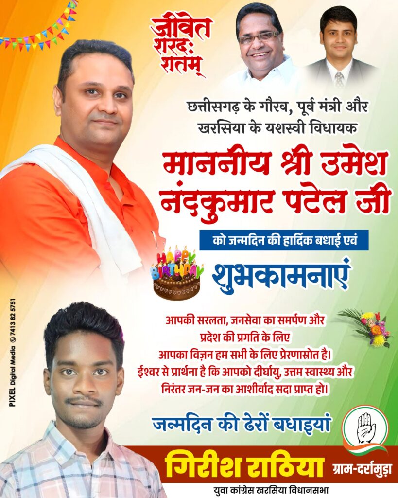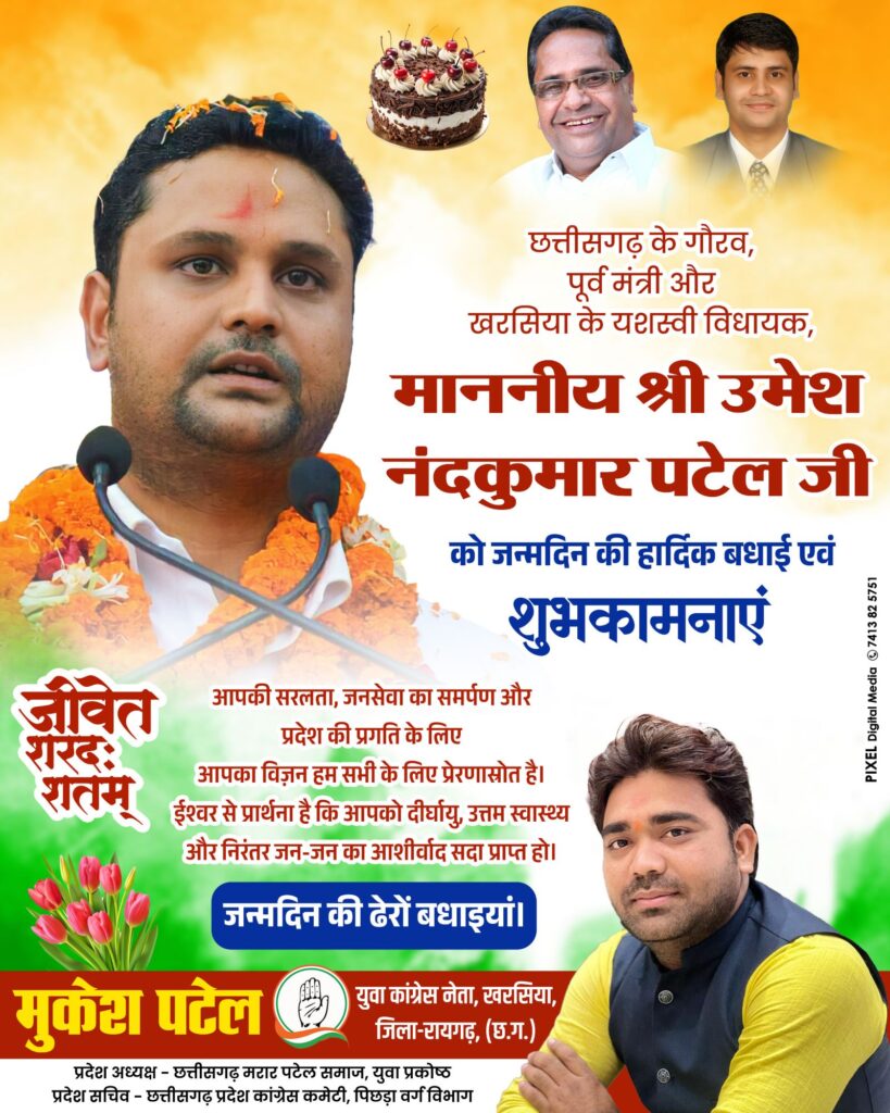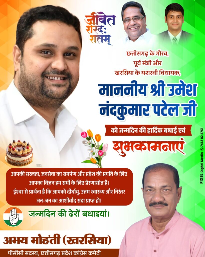 खरसिया, 26 नवंबर 2025। छत्तीसगढ़ के पूर्व मंत्री और खरसिया विधानसभा क्षेत्र के लोकप्रिय विधायक उमेश नंदकुमार पटेल का जन्मदिन आज बड़े ही उत्साह, धूमधाम और हर्षोल्लास के साथ मनाया गया। विधायक की अनुपस्थिति के बावजूद, कांग्रेस परिवार ने दिनभर विभिन्न सामाजिक और संगठनात्मक कार्यक्रमों का आयोजन कर इस दिवस को सही मायनों में ‘सेवा दिवस’ के रूप में समर्पित किया। दिनभर पूरे क्षेत्र में एकजुटता, उत्साह और जनभावना का माहौल देखने को मिला। उनके समर्थकों, कार्यकर्ताओं और आम जनता ने विधायक के प्रति अपनी श्रद्धा और स्नेह प्रकट किया, साथ ही उनके कार्यों को याद करते हुए सकारात्मक संदेश और प्रेरणा साझा की।