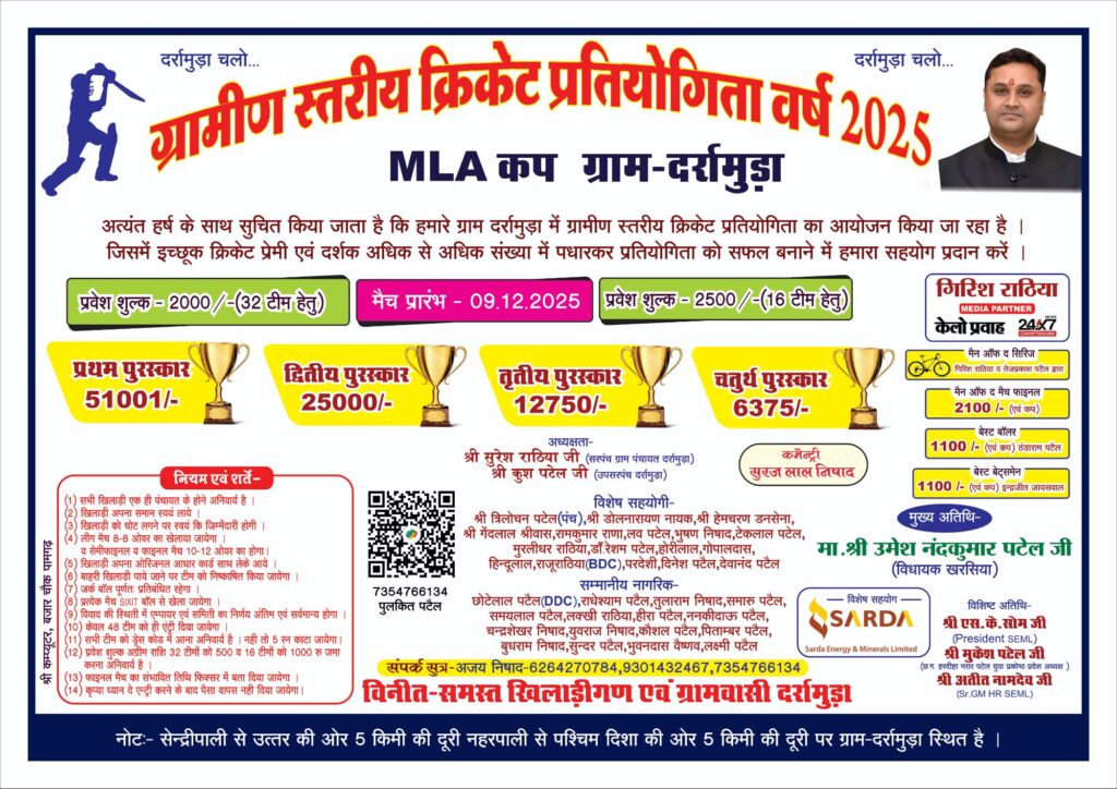 खरसिया। खरसिया क्षेत्र में खेल प्रतिभाओं को मंच देने और ग्रामीण उत्साह को बढ़ाने के लिए एक बड़ा आयोजन होने जा रहा है। खरसिया के दर्रामुड़ा गांव में 9 दिसंबर 2025 से ‘ग्रामीण स्तरीय क्रिकेट प्रतियोगिता – MLA कप’ का भव्य आगाज होगा। यह प्रतियोगिता पूरी तरह से ग्रामवासियों और खिलाड़ियों की पहल पर आयोजित की जा रही है, जिसे लेकर पूरे अंचल में जबरदस्त उत्साह देखा जा रहा है। प्रतियोगिता के प्रमुख आयोजक विजय पटेल, अजय निषाद और पुलकित पटेल से मिली जानकारी के मुताबिक, यह टूर्नामेंट ग्रामीण स्तर पर क्रिकेट को नई पहचान देगा और युवा खिलाड़ियों को अपनी क्षमता साबित करने का मौका प्रदान करेगा। इस प्रतियोगिता का मुख्य आकर्षण इसकी बड़ी पुरस्कार राशि है, जो इसे आस-पास के क्षेत्रों में एक बड़ा इवेंट बनाती है।