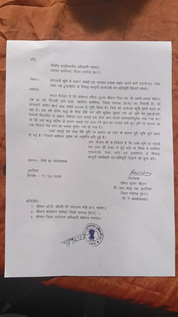 ऐसा ही ताजा मामला खरसिया तहसील से लगे ग्राम चोढ़ा का है, जहां कोटवारी भूमि पर जिसका खसरा नंबर 604 है जिसका रकबा 0.2140 हेक्टेयर है। फसल बर्बाद होने की लिखित शिकायत को कोटवार रविंद्र चौहान ने खरसिया एसडीएम कार्यालय पहुंच किया है। उक्त शिकायत की प्रतिलिपि पर्यावरण मंत्री ओपी चौधरी, जिला कलेक्टर रायगढ़ एवं जिला पर्यावरण अधिकारी को भी प्रेषित किया है। शिकायत में दोषी प्लांट प्रबंधन के विरुद्ध एवं संबंधित ठेकेदार के विरुद्ध कार्यवाही की मांग करते हुये फसल नुकसानी दिलाये जाने की बात कही है। अब इस मामले पर विभाग क्या कार्यवाही करता है या फिर सिर्फ शिकायत पर लीपापोती कर दिया जाता है। यह तो वक्त ही बताएगा, फिलहाल लगातार खुले में फ्लाइएश फेंकने से लगातार दुर्घटना एवं प्रदूषण सामने आ रहे है।