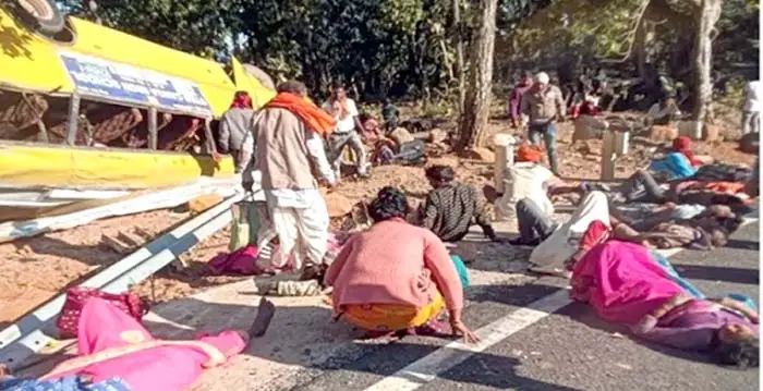 बलरामपुर। झारखंड के महुआडांड़ थाना क्षेत्र के ओरसा घाटी में रविवार को दर्दनाक सडक़ हादसा हो गया। छत्तीसगढ़ से झारखंड जा रही बस अनियंत्रित होकर पलट गई, जिससे घटना स्थल पर अफरा-तफरी मच गई। ग्रामीणों के अनुसार इस हादसे में पांच महिला सहित 7 लोगों की मौत गई है, जबकि 87 यात्री घायल हुए हैं। हालांकि मृतकों की संख्या को लेकर प्रशासन की ओर से अभी आधिकारिक पुष्टि नहीं की गई है। इस हादसे पर मुख्यमंत्री विष्णुदेव साय ने शोक जताया है।
